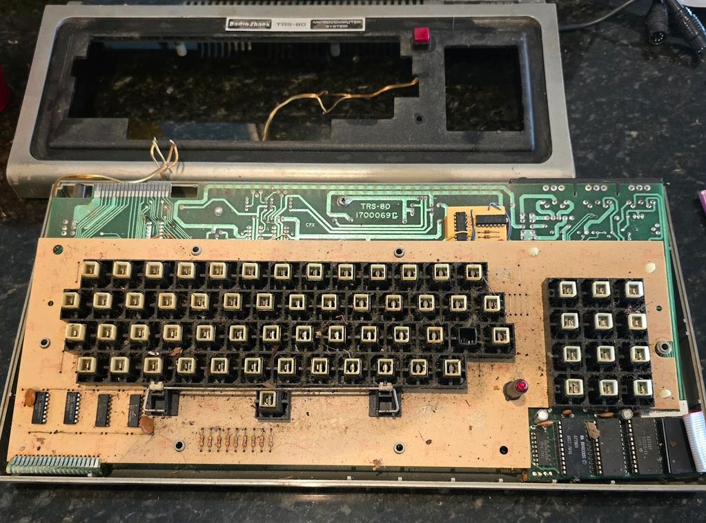 Initial disassembly... notice the red "reset" button added by the owner (the main reset button is hard to reach at the back of the case). We cleaned the main circuit boards and the case as much as possible.