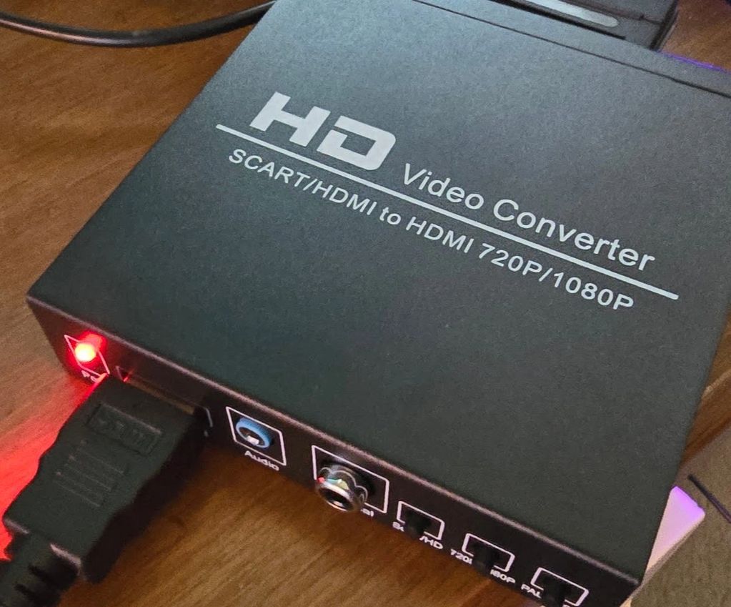 For video, the Alice uses SECAM/SCART output. We use a video converter which translates from SECAM or PAL to NTSC and adapts from the SCART to HDMI interface.