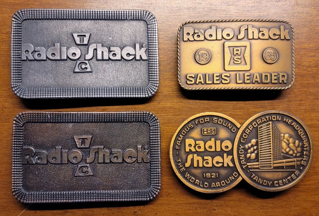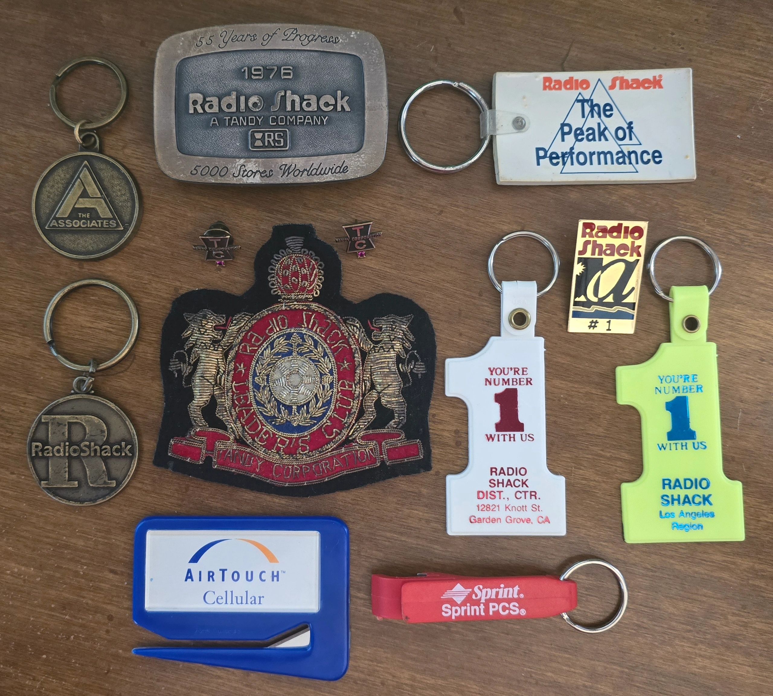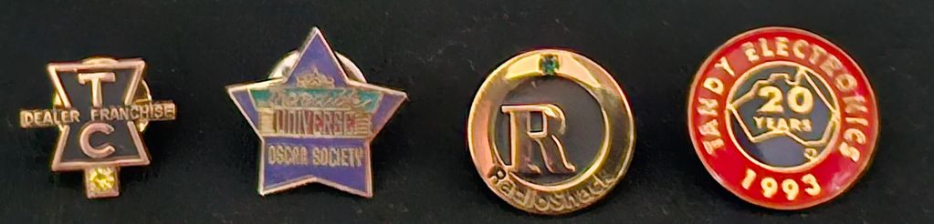 Here we see an anniversary pin for a Dealer/Franchise store, as well as for the newer RadioShack branding. Also shown are an Incredible Universe "Oscar Society" pin and a pin commemorating the 20th anniversary of Tandy Electronics in Australia.