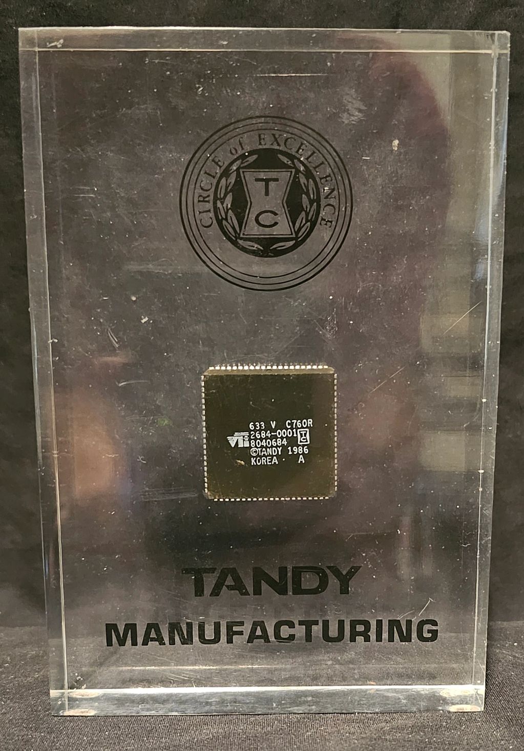The 8040684 Video Processor was used in several of the Tandy 1000 series computers, including the 1000EX and 1000HX. This acrylic "Circle of Excellence" award was given in recognition of the circuit design.